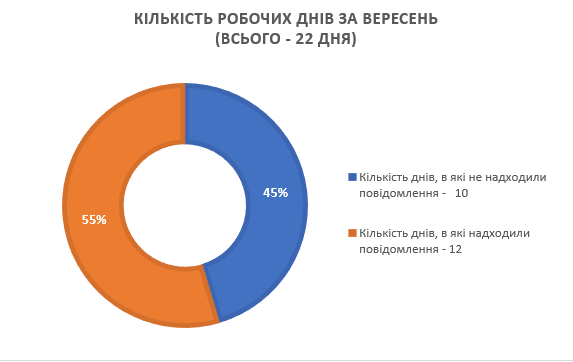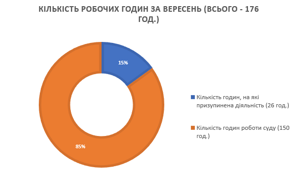 Загальна кількість робочих годин у вересні становила 176 год., з яких на 26 годин суд був змушений призупинити діяльність, а впродовж 150 годин правосуддя здійснювалося у штатному режимі.
